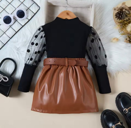 Black ribbed top with mesh sleeve & leather skirt with belt