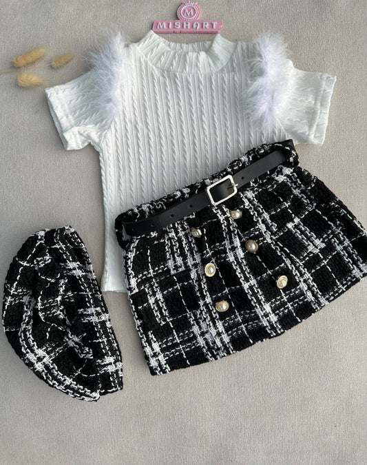 Hot selling tweed skirt , feather top with belt & hat