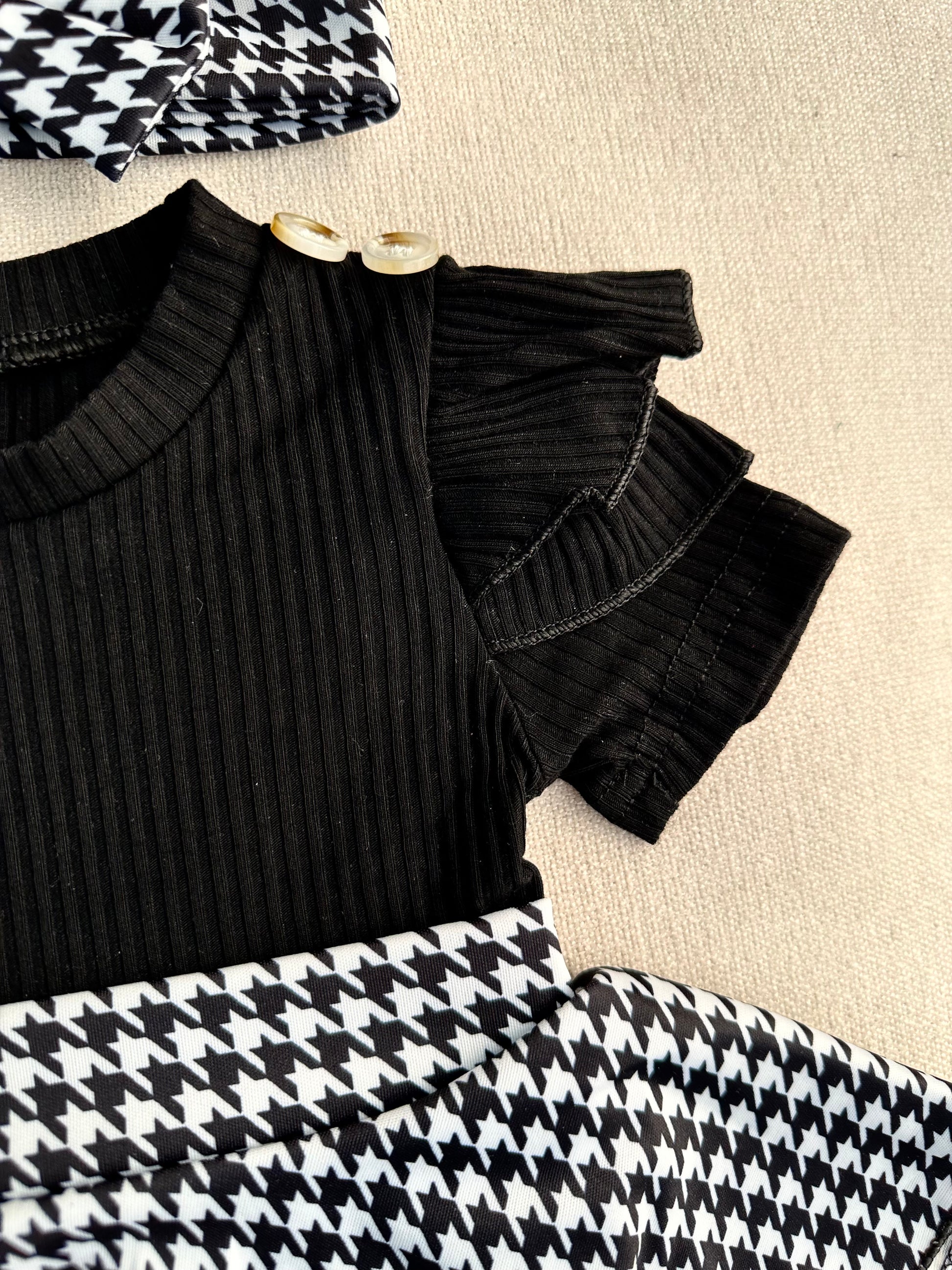 - Soft ribbed black bodice with delicate ruffle sleeves